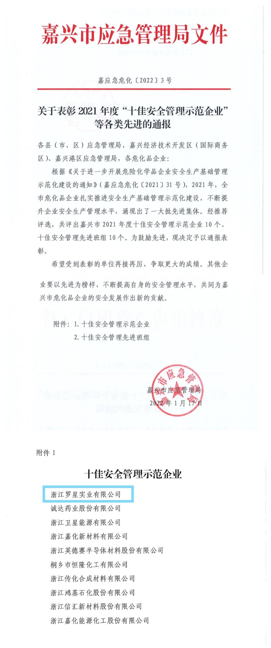 2022年1月17日,嘉興市應(yīng)急管理局公布了“嘉興安全管理示范企業(yè)”評選結(jié)果,本公司榮獲“嘉興市十佳安全管理示范企業(yè)”。