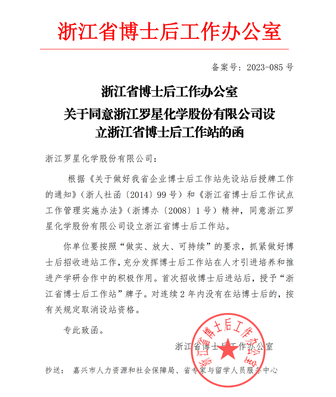 近日,公司收到浙江省博士后工作辦公室下發(fā)的《浙江省博士后工作辦公室關(guān)于同意浙江羅星化學(xué)股份有限公司設(shè)立浙江省博士后工作站的函》,公司獲批設(shè)立浙江省博士后工作站!